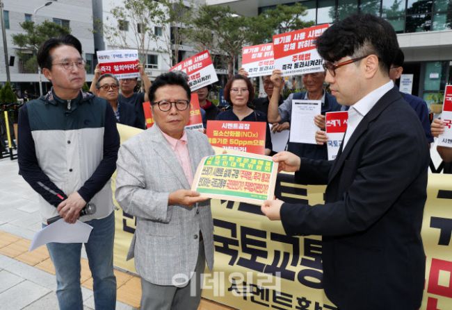 박남화(왼쪽 두번째) 시멘트환경문제해결범국민대책위원장과 장기석(첫번째) 폐기물협회 전무가 29일 서울 창성동 국정기획위원회 앞에서 집회를 갖고 국정기획위원회 관계자에게 정책건의서를 전달하고 있다. 시멘트환경문제해결 범국민대책위 회원들은 이날 환경피해와 국민 건강까지 위협하는 쓰레기 시멘트 실체를 규명할 것을 요구하고 주택법 즉각 통과를 촉구했다. 시멘트환경