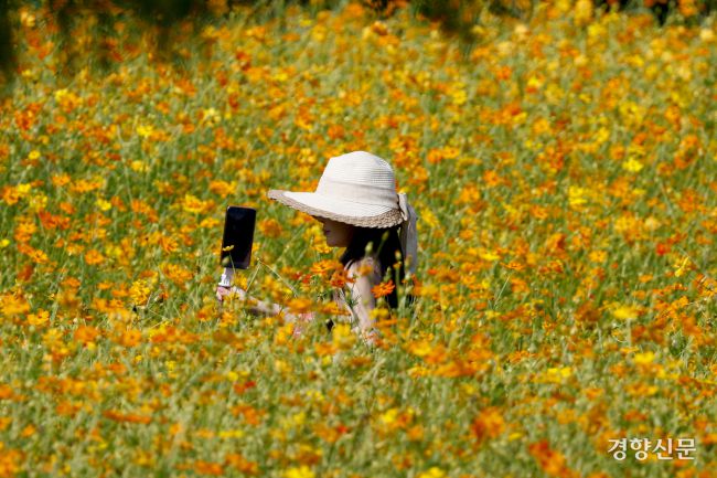 전국 대부분 지역에 폭염 특보가 발효 중인 29일 경기 남양주 한강공원 삼패지구에 조성된 황화코스모스밭에서 시민들이 가을의 정취를 만끽하고 있다. 문재원 기자 절기상 여름이 지나며 더위도 가시고 신선한 가을을 맞이하게 된다는 ‘처서’가 엿새 지났다. 아직 더위는 여전하지만, 그래도 가을은 한 걸음씩 다가오고 있다. 29일 찾은 경기 남양주 한강공원 삼패지구