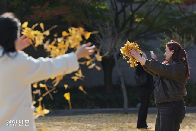 21일 서울 종로구 국립고궁박물관을 찾은 시민들이 떨어진 은행잎을 주워 던지고 있다. 정효진 기자 주 초반 쌀쌀했던 날씨가 온화해지며 주말까지는 늦가을을 즐길 수 있게 됐다. 21일 서울의 낮 기온은 15도 안팎까지 올라 평년보다 온화한 날씨를 보였다. 이날 서울 종로구 국립고궁박물관을 찾은 시민들은 바닥을 가득 메운 은행잎을 배경으로 마지막 가을 추억을