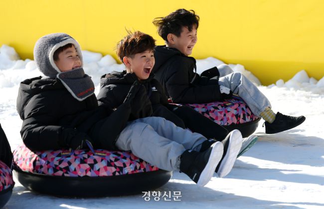 성탄절인 25일 서울 노원구 서울과학기술대학교 종합운동장에 마련된 ‘노원 씽씽 눈썰매장’을 찾은 어린이들이 눈썰매를 타고 있다. 성탄절인 25일 서울 노원구 서울과학기술대학교 종합운동장에 마련된 ‘2026 씽씽눈썰매장’에는 영하의 날씨에도 많은 시민들과 어린이들이 찾아 연휴를 즐겼다. 지난 23일 문을 연 ‘2026 씽씽눈썰매장’은 노원구 겨울철 대표 야외