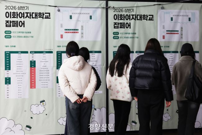 서울 서대문구 이화여자대학교에서 10일 열린 ‘2026년 상반기 채용박람회 이화 잡페어’를 찾은 학생들이 안내도를 보고 있다. 한수빈 기자 붐비는 채용 상담 부스 사이로 이력서를 들고 줄을 선 청년들의 발걸음이 이어졌다. 이화여자대학교가 9일 교내 ECC 이삼봉홀과 다목적홀 등에서 상반기 채용 박람회 ‘이화 잡페어’를 열었다. 이번 박람회에는 삼성·CJ 등