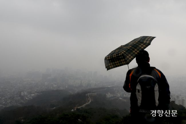 서울에 미세먼지를 동반한 비가 내린 6일 서울 종로구 인왕산에서 바라본 도심이 뿌옇다. 문재원 기자 서울에 미세먼지를 동반한 비가 내린 6일 서울 종로구 인왕산에서 바라본 도심이 뿌옇다. 문재원 기자 미세먼지로 인해 전국 대부분이 흐린 6일 서울을 포함한 중부지방에 비가 내렸다. 기상청은 이날 미세먼지 농도는 수도권·강원 영서·충청권·호남권·영남권·제주권은