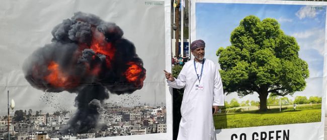 아랍에메레이트 두바이 COP28 총회장 앞에 설치된 기후위기 해결을 위한 캠페인 그림 앞에서 지난 8일 총회 참석자가 기념사진을 찍고 있다. /이제석광고연구소 제공 제28차 유엔기후변화협약 당사국총회(COP28) 한국대표단이 아랍에미리트(UAE) 두바이에서 전쟁 반대와 기후위기 해결을 촉구하는 퍼포먼스를 펼쳤다. 환경재단과 이제석광고연구소, 기후환경 활동가