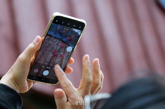 12일 오전 서울 강남구 삼성동 봉은사 경내에서 한 시민이 휴대전화 카메라로 활짝 핀 홍매화 사진을 찍고 있다. 2025.3.16. 정지윤 선임기자 봄꽃이 채 피기도 전에 꽃샘추위가 먼저 찾아왔다. 꽃샘추위가 시작된 16일 홍매화 사진을 찍기 위해 서울 강남구 봉은사를 찾았다. 비까지 추적추적 내려서 체감온도는 어제와 비교할 수 없을 정도로 낮았다. 서울에
