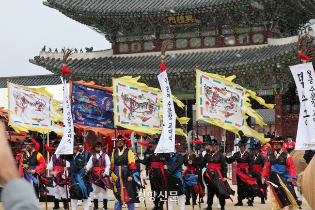 꽃샘추위와 함께 눈이 내린 30일 서울 종로구 경복궁 흥례문 앞 광장에서 ‘2025 전국 수문장 임명의식’이 진행되고 있다. 2025.3.30. 정지윤 선임기자 일요일인 30일 오전 서울 경복궁에서 수문장 임명의식이 열렸다. 수문장 임명의식은 매년 한 차례 봄에 열린다. 수문장은 조선 시대 도성 및 궁궐의 각 문을 지키던 관직을 뜻한다. 수문장 임명의식은