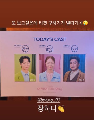 온주완 방민아. 사진| 온주완 SNS 배우 온주완이 예비 신부 방민아 공개 응원에 나섰다. 온주완은 1일 자신의 SNS에 방민아가 출연 중인 뮤지컬 ‘어쩌면 해피엔딩’ 현장을 공개했다. 이날 온주완은 ‘어쩌면 해피엔딩’에 대해 “너무나 사랑스러운 극이다”라며 후기를 남겼다. 또한 이날 공연에 아내 방민아가 참여하자 “또 보고 싶은데 티켓 구하기가 별따기”라
