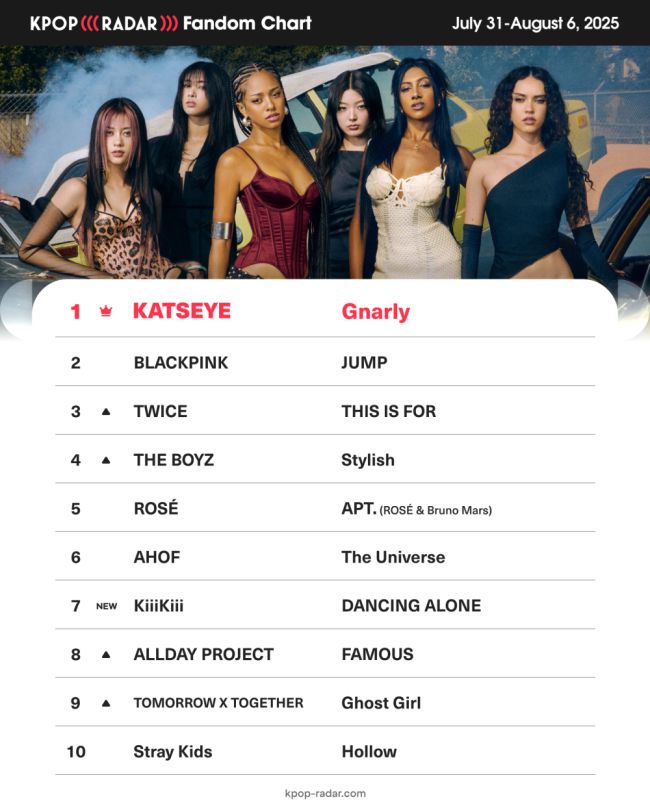 하이브와 게펜 레코드의 합작 걸그룹 캣츠아이가 '케이팝레이더(K-POP RADAR)' 위클리 팬덤 차트 정상에 올랐다. 위클리 팬덤 차트는 한 주간 팬덤 지표가 가장 크게 성장한 아티스트를 증감률 기준으로 순위를 매기는 차트다. 8일 발표된 최신 차트에 따르면, 캣츠아이는 지난 4월 발매한 곡 '날리(Gnarly)'로 1위를 차지했다. '날리' 뮤직비디오는