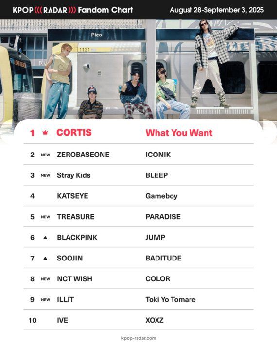 코르티스가 '케이팝레이더(K-POP RADAR)' 위클리 팬덤 차트에서 2주 연속 정상에 올랐다. 위클리 팬덤 차트는 한 주간 팬덤 지표가 가장 크게 성장한 아티스트를 증감률 기준으로 순위를 매기는 차트다. 5일 발표된 차트에 따르면, 코르티스는 데뷔곡 '왓 유 원트(What You Want)'로 다시 한번 1위를 차지했다. 코르티스의 '왓 유 원트' 뮤직