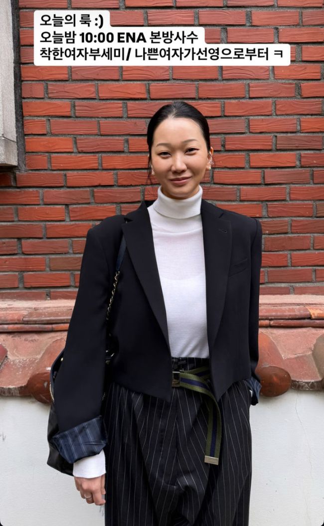 [서울=뉴시스] 모델 겸 배우 장윤주. (사진=장윤주 인스타그램 캡처) 2025.10.13. photo@newsis.com *재판매 및 DB 금지 [서울=뉴시스]신지아 인턴 기자 = 모델 겸 배우 장윤주가 시크한 매력을 뽐냈다. 그는 13일 소셜미디어에 "오늘의 룩, 오늘 밤 10시 ENA 본방사수. 착한여자부세미 나쁜 여자가 선영으로부터"라는 글과 함께