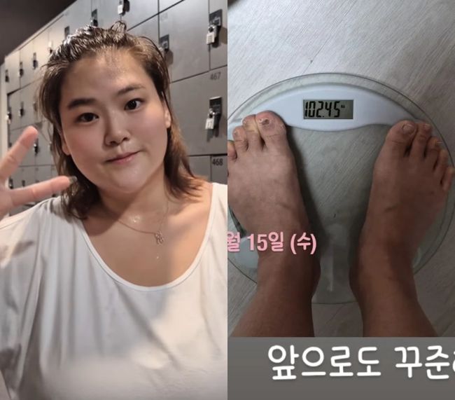 사진=수지 씨 SNS 가수 미나의 시누이 수지 씨가 다이어트 근황을 전했다. 수지 씨는 지난 15일 자신의 인스타그램 스토리에 "앞으로도 꾸준히"라는 문구와 함께 한 장의 사진을 게재했다. 공개된 사진 속에는 수지 씨가 이른 아침 7시부터 일어나 자신의 몸무게를 체크하는 모습. 앞서 "몸무게는 중요하지 않다"라며 운동에도 불어난 체중에 낙담했던 수지 씨는