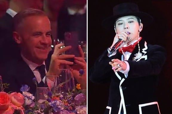 마크 카니 캐나다 총리(왼쪽)가 31일 APEC 정상회의 환영 만찬에서 지드래곤의 공연을 촬영하고 있다. [TV 중계 캡처] APEC(아시아태평양경제협력체) 홍보대사인 가수 지드래곤(본명 권지용·37)이 아태 지역 정상들을 완전히 사로잡았다. 지드래곤은 지난달 31일 경주 라한호텔 대연회장에서 열린 ‘APEC 정상회의 환영 만찬’ APEC(아시아태평양경제협
