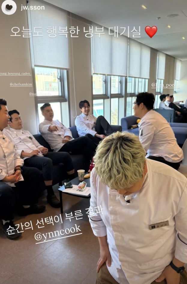 윤남노. 사진|손종원 인스타그램 윤남노 셰프가 ‘냉장고를 부탁해’ 대기실에서 무릎을 꿇었다. 손종원 셰프는 28일 인스타그램에 “오늘도 행복한 냉부(냉장고를 부탁해) 대기실”이라며 “순간의 선택이 부른 결과”라는 글과 사진이 올라왔다. 공개된 사진에는 김풍, 권성준, 손종원, 샘킴, 정호영 셰프가 JTBC 예능 ‘냉장고를 부탁해’ 대기실에 앉아있는 모습이