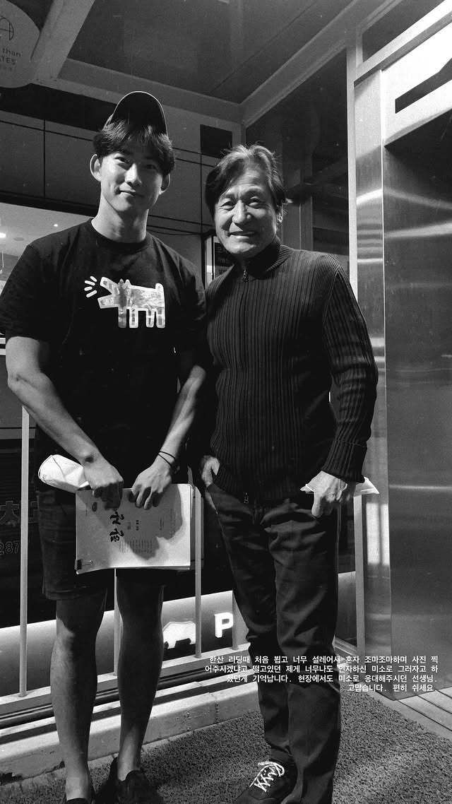 옥택연과 故안성기(옥택연 SNS) (서울=뉴스1) 고승아 기자 = 그룹 2PM 겸 배우 옥택연이 고(故) 안성기와 추억을 회상했다. 옥택연은 지난 5일 자신의 인스타그램 스토리에 "'한산' 리딩 때 처음 뵙고 너무 설레서 혼자 조마조마하며 사진 찍어주시겠냐고 떨고 있던 제게 너무나도 인자하신 미소로 그러자고 하셨던 게 기억납니다"라고 글을 올렸다. 옥택연과