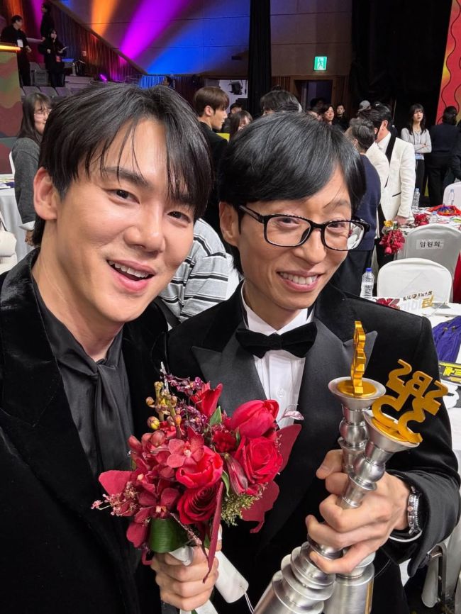사진 = 유연석 인스타그램 배우 유연석이 유재석과 함께 훈훈한 투샷을 공개해 눈길을 끌었다. 유연석은 자신의 인스타그램에 'SBS 연예대상' 수상 후 찍은 사진을 게시했다. 사진 = 유연석 인스타그램 사진 속 유연석은 유재석과 함께 웃고 있다. 시상식 현장에서 블랙 수트를 갖춰 입고 트로피를 들고 환한 미소를 짓고 있으며, 꽃다발을 품에 안은 채 무대 앞과