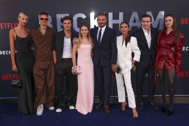 왼쪽부터 미아 리건, 로미오 베컴, 크루즈 베컴, 하퍼 베컴, 데이비드 베컴, 빅토리아 베컴, 브루클린 베컴, 니콜라 펠츠 베컴이 2023년 10월 3일 영국 런던에서 열린 TV 프로그램 ‘베컴’ 시사회에 참석해 포즈를 취하고 있다. 브루클린 베컴(왼쪽)과 니콜라 펠츠가 2024년 9월 27일 프랑스 파리에서 열린 빅토리아 베컴 2025 봄·여름 컬렉션에