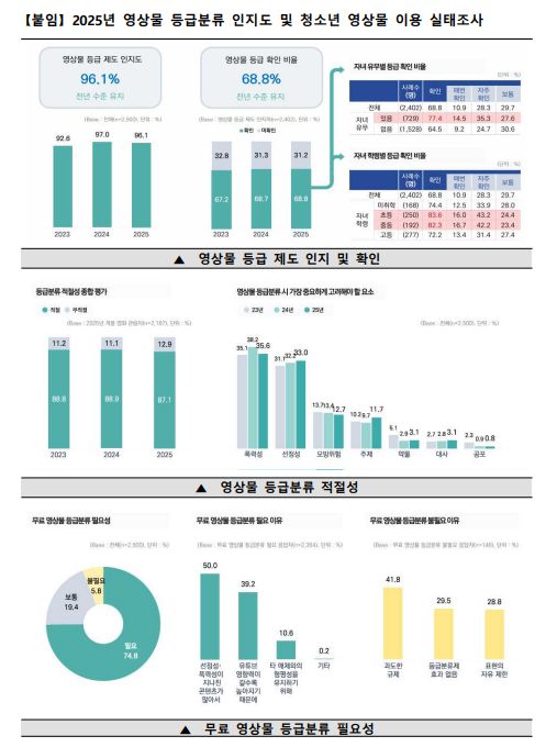 영상물등급위원회(이하 영등위, 위원장 김병재)는 2025년 11월부터 12월까지 일반국민 2,500명과 청소년 2,000명을 대상으로 실시한 「영상물 등급분류 인지도 및 청소년 영상물 이용 실태조사」 결과를 발표했다. 조사 결과, 국민의 96.1%가 등급분류 제도를 인지하고 있었으며 87.1%는 현행 등급분류 수준이 적절하다고 응답해 제도에 대한 높은 신뢰
