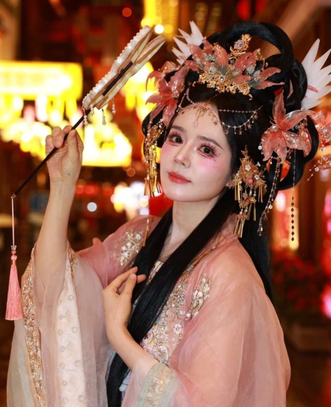 사진 = 한가인 인스타그램 배우 한가인의 화려한 미모가 시선을 모은다. 최근 한가인은 자신의 인스타그램에 별다른 멘트 없이 왕훙 메이크업을 한 사진을 게시했다. 사진 속 한가인은 분홍빛이 도는 중국 전통 의상을 입고 긴 검은 머리를 늘어뜨린 채 화려한 장식이 달린 전통 스타일의 머리 장식을 착용하고 있으며 머리 위와 양옆에는 꽃 모양 장식과 금빛 장식이 촘