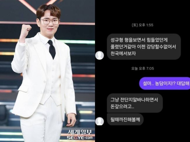 사진=세계일보 자료사진, 장성규 SNS 방송인 장성규가 극단적인 메시지를 보낸 팬을 향해 걱정되는 심경을 내비쳤다. 지난 17일 장성규는 자신의 인스타그램을 통해 팬들과의 메신저 대화 내용을 공개했다. 장성규는 자신의 유튜브 콘텐츠를 보고 아내와 딸 없이 홀로 일본 여행을 떠난다는 메시지, 자신의 속옷 색깔을 묻는 짖궃은 메시지를 모두 공개하며 "화요 특집