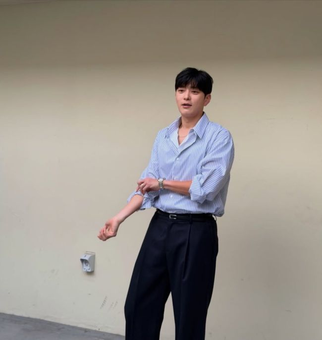 사진 = 장승조 인스타그램 배우 장승조의 놀라운 비주얼이 감탄을 자아내고 있다. 최근 장승조는 자신의 인스타그램에 새 드라마 '멋진 신세계' 언급과 "피드맞추기~^^"라는 멘트와 사진을 올렸다. 사진 = 장승조 인스타그램 사진 속 장승조는 밝은 베이지색 벽을 배경으로 서서 소매를 걷어 올리고 있다. 푸른색 셔츠를 자연스럽게 풀어 입고 검은 슬랙스를 매치한