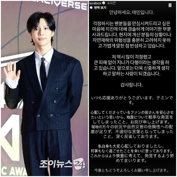 샤이니 태민이 일본 지진과 관련한 발언에 사과했다. 태민은 6일 자신의 인스타스토리에 "걱정하시는 팬분들을 안심시켜 드리고 싶은 마음에 지진에 대해 경솔하게 이야기한 부분 사과드린다"고 말문을 열었다. 이어 "현지에 계신 분들의 상황이나 자연재해의 위험성을 충분히 고려하지 못하고 가볍게 말한 점 반성한다"고 전했다. 태민 [사진=조이뉴스24 DB, 태민 인