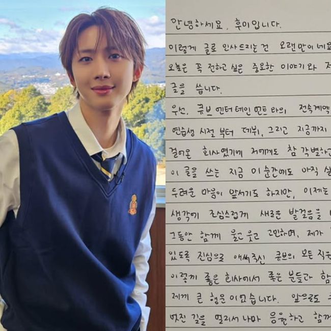 사진=후이 SNS 그룹 펜타곤 멤버 후이가 소속사 큐브엔터테인먼트를 떠나는 심경을 전했다. 후이는 지난 16일 자신의 인스타그램을 통해 "꼭 전하고 싶은 중요한 이야기가 있어 글을 쓴다"며 "큐브엔터테인먼트와의 계약이 종료됐다. 연습생 시절부터 함께 했기에 각별한 곳"이라며 말문을 열었다. 그는 "지금도 실감이 잘 나지 않고 두려운 마음이 앞서지만, 또 다
