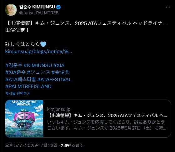 글로벌 팬덤을 거느린 K팝 아티스트 김준수가 'ATA 페스티벌 2025' 소식을 자신의 X(구 트위터) 계정에 올렸다. 김준수가 올해 ATA 페스티벌의 헤드라이너를 맡게 됐다는 내용이다. 25일 대중문화업계에 따르면 김준수는 자신의 일본 공식 팬클럽에 올라온 올해 ATA 페스티벌 소식을 자신의 X 계정에 공유했다. 공유한 내용은 김준수의 일본 공식 팬클럽이