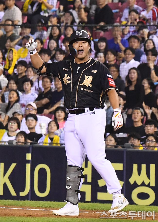 11일 서울 잠실야구장에서 열린 2025 KBO리그 KT 위즈와 LG 트윈스의 경기, 7회초 무사 1,2루 KT 강백호가 1타점 적시타를 날리고 있다. 2025.09.11. [스포츠투데이 팽현준 기자 sports@stoo.com]