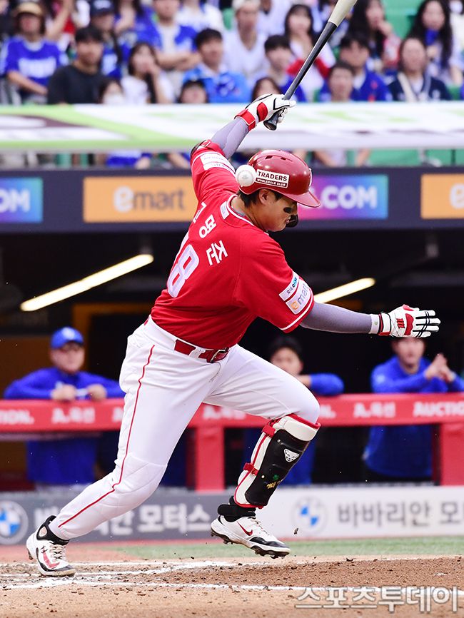 2025 신한은행 SOL Bank KBO리그 포스트시즌 준플레이오프 2차전 삼성 라이온즈와 SSG 랜더스의 경기가 11일 인천SSG 랜더스필드에서 열렸다. SSG 고명준이 6회말 타석에서 타격한 공이 몸에 맞아 아웃되고 있다. 2025.10.11. [스포츠투데이 권광일 기자 sports@stoo.com]