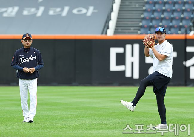 한화 양상문 코치가 17일 대전한화생명볼파크에서 열리는 2025 KBO리그 포스트시즌 플레이오프 1차전을 앞두고 정우주의 훈련을 지켜보고 있다. 2025.10.17. [스포츠투데이 팽현준 기자 sports@stoo.com]