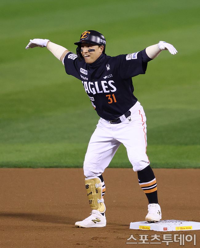 27일 서울 잠실야구장에서 열린 2025 KBO리그 LG 트윈스와 한화 이글스의 한국시리즈 2차전, 1회초 2사 한화 손아섭이 좌익수 왼쪽 2루타를 날리고 있다. 2025.10.27. [스포츠투데이 팽현준 기자 sports@stoo.com]
