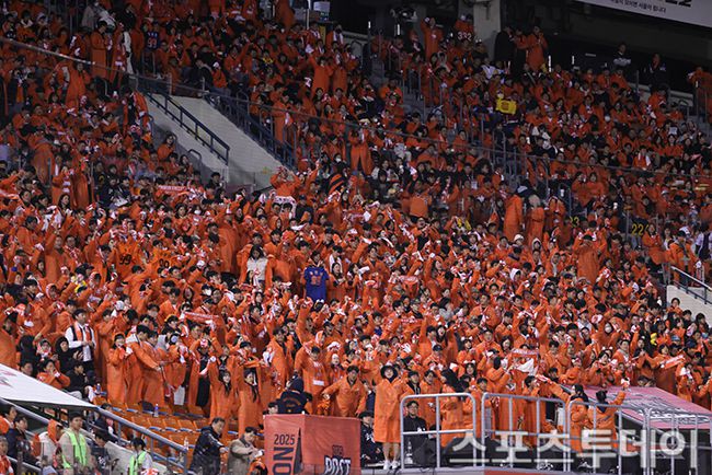 27일 서울 잠실야구장에서 열린 2025 KBO리그 LG 트윈스와 한화 이글스의 한국시리즈 2차전, 한화 우비 응원단이 응원을 하고 있다. 2025.10.27. [스포츠투데이 팽현준 기자 sports@stoo.com]