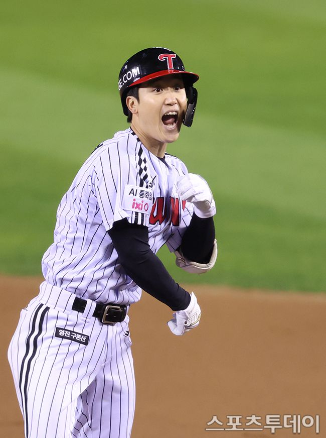 27일 서울 잠실야구장에서 열린 2025 KBO리그 LG 트윈스와 한화 이글스의 한국시리즈 2차전, 2회말 무사 2,3루 LG 구본혁이 2타점 적시타를 때리고 있다. 2025.10.27. [스포츠투데이 팽현준 기자 sports@stoo.com]