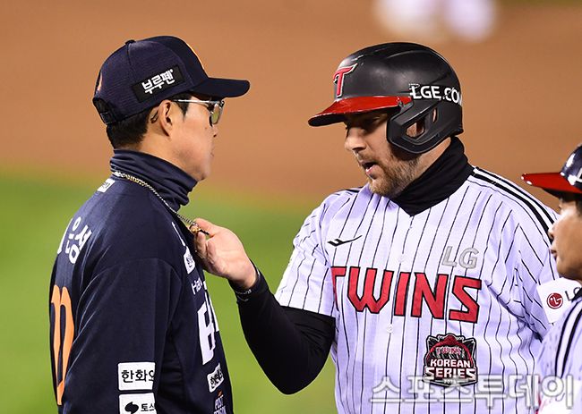 2025 신한은행 SOL Bank KBO리그 한국시리즈 2차전 한화 이글스와 LG 트윈스의 경기가 27일 서울 잠실야구장에서 열렸다. LG 오스틴이 6회말 1루에서 채은성과 대화를 나누고 있다. 2025.10.27. [스포츠투데이 권광일 기자 sports@stoo.com]