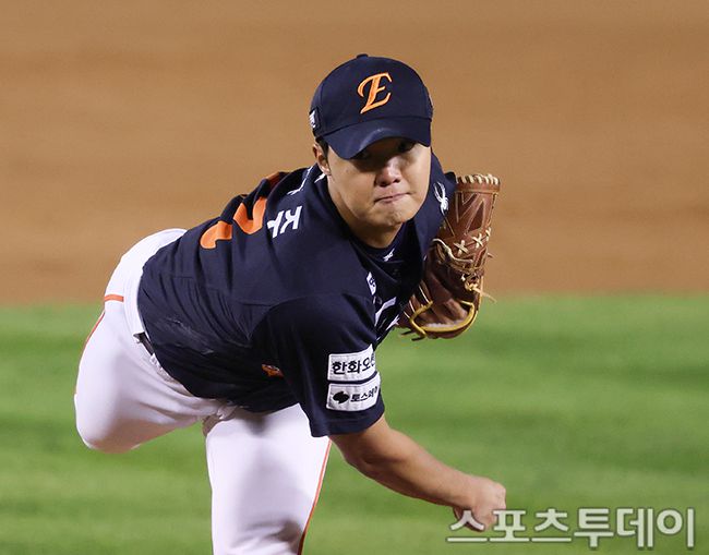 27일 서울 잠실야구장에서 열린 2025 KBO리그 LG 트윈스와 한화 이글스의 한국시리즈 2차전, 8회말 한화 정우주가 역투하고 있다. 2025.10.27. [스포츠투데이 팽현준 기자 sports@stoo.com]