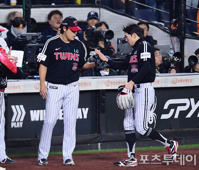 2025 신한은행 SOL Bank KBO리그 한국시리즈 3차전 LG트윈스와 한화 이글스의 경기가 29일 대전한화생명 볼파크에서 열렸다. LG 김진성이 6회말 중견수 플라이볼을 잡은 박해민과 하이파이브를 하고 있다. 2025.10.29. [스포츠투데이 권광일 기자 sports@stoo.com]