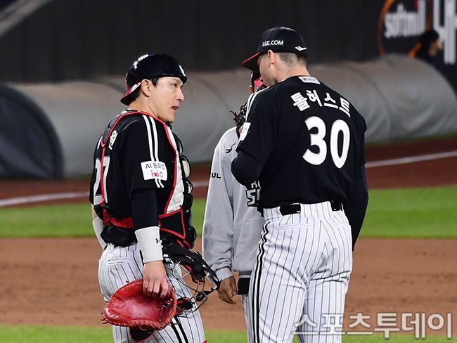2025 신한은행 SOL Bank KBO리그 한국시리즈 5차전 LG트윈스와 한화 이글스의 경기가 31일 대전한화생명 볼파크에서 열렸다. LG 박동원이 3회말 마운드에 올라가 톨허스트와 대화를 나누고 있다. 2025.10.31. [스포츠투데이 권광일 기자 sports@stoo.com]