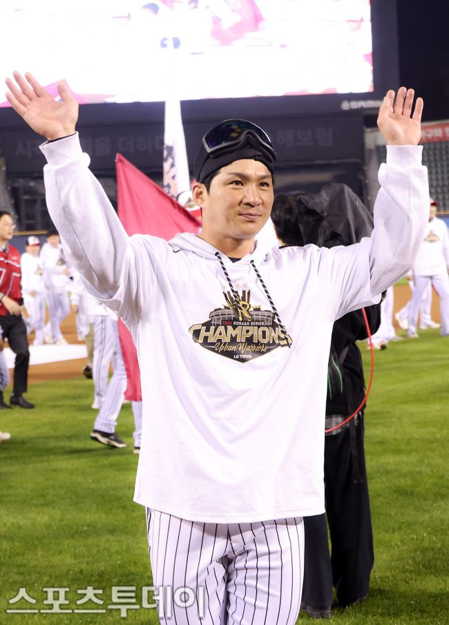 LG트윈스의 2025 한국시리즈 우승 세리머니가 1일 오후 서울 잠실야구장에서 열렸다. 이날 LG트윈스 오지환 선수가 팬들에 인사를 하고 있다. 2025.11.01 [스포츠투데이 안성후 기자 sports@stoo.com]