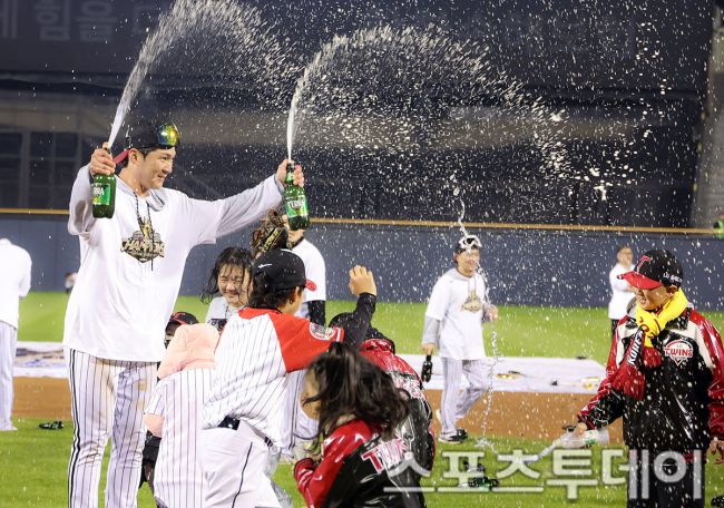 LG트윈스의 2025 한국시리즈 우승 세리머니가 1일 오후 서울 잠실야구장에서 열렸다. 이날 LG트윈스 오지환 선수가 샴페인 세리머니를 하고 있다. 2025.11.01 [스포츠투데이 안성후 기자 sports@stoo.com]