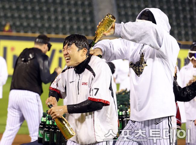 LG트윈스의 2025 한국시리즈 우승 세리머니가 1일 오후 서울 잠실야구장에서 열렸다. 이날 LG트윈스 홍창기 선수가 박해민 선수에 샴페인을 들이붓고 있다. 2025.11.01 [스포츠투데이 안성후 기자 sports@stoo.com]