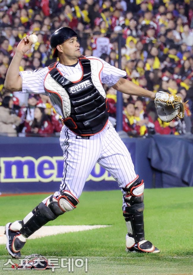 LG트윈스의 2025 한국시리즈 우승 세리머니가 1일 오후 서울 잠실야구장에서 열렸다. 이날 팬들을 위한 이벤트 경기에서 LG 치리노스 선수가 송구를 하고 있다. 2025.11.01 [스포츠투데이 안성후 기자 sports@stoo.com]