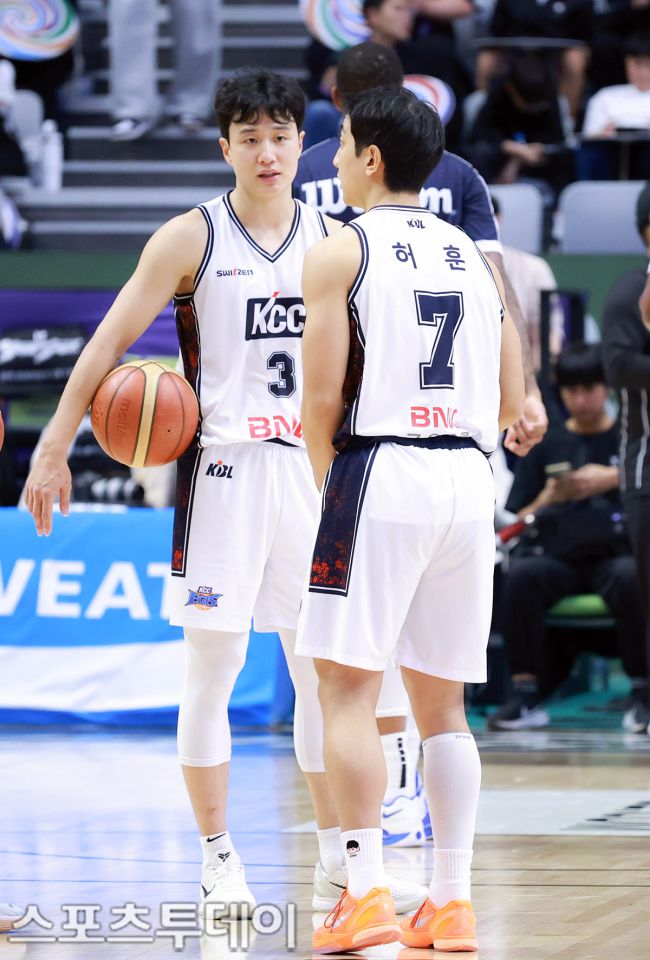 2025-2026 LG전자 프로농구 수원 KT-부산 KCC 경기가 8일 오후 경기 수원시 수원KT 소닉붐 아레나에서 열렸다. 이날 부산 KCC 허훈, 혀웅 형제가 이야기를 나누고 있다. 2025.11.08. [스포츠투데이 안성후 기자 sports@stoo.com]