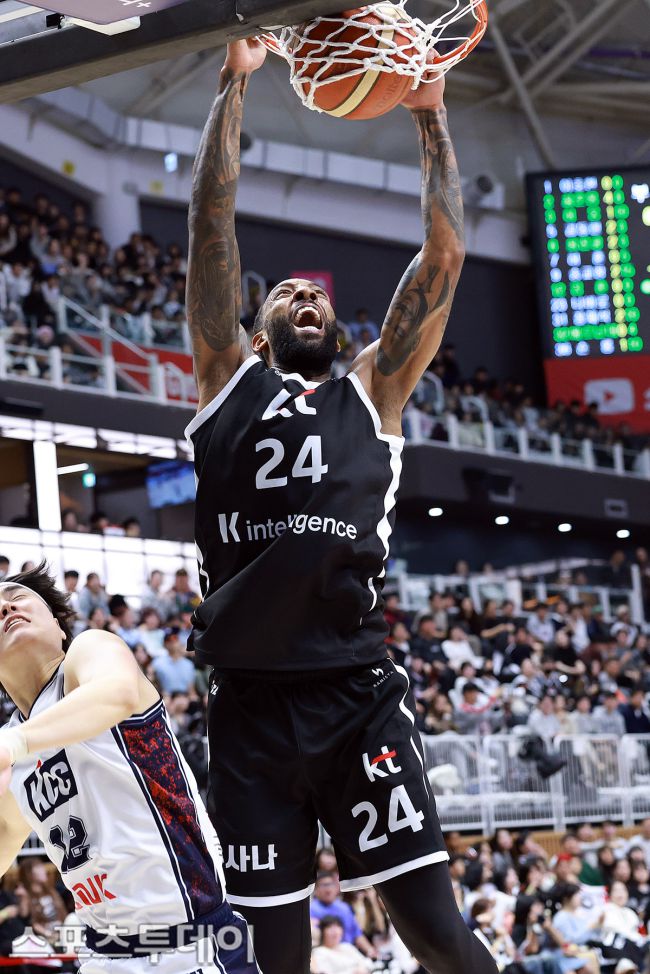 2025-2026 LG전자 프로농구 수원 KT-부산 KCC 경기가 8일 오후 경기 수원시 수원 KT 소닉붐 아레나에서 열렸다. 이날 수원 KT 소닉붐 데릭 윌리엄스가 덩크를 날리고 있다. 2025.11.08. [스포츠투데이 안성후 기자 sports@stoo.com]