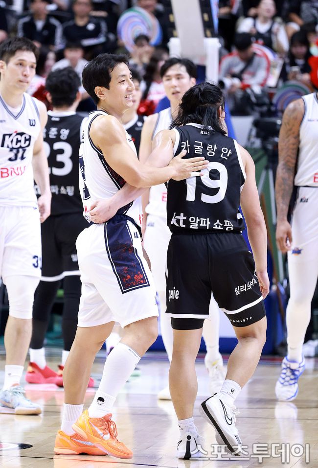 2025-2026 LG전자 프로농구 수원 KT-부산 KCC 경기가 8일 오후 경기 수원시 수원 KT 소닉붐 아레나에서 열렸다. 이날 부산 KCC 허훈이 친정팀 동료였던 수원 KT 조엘 카굴랑안과 친밀감을 표시하고 있다. 2025.11.08. [스포츠투데이 안성후 기자 sports@stoo.com]