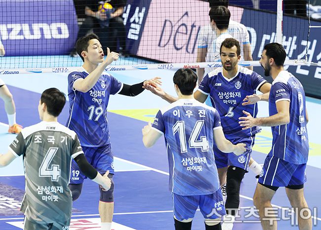 2025-2026 진에어 V-리그 남자부 대한항공-삼성화재 경기가 12일 인천 계양체육관에서 열렸다. 삼성화재 양희준이 도산지에게 엄지척을 하고 있다. 2025.11.12. [스포츠투데이 권광일 기자 sports@stoo.com]