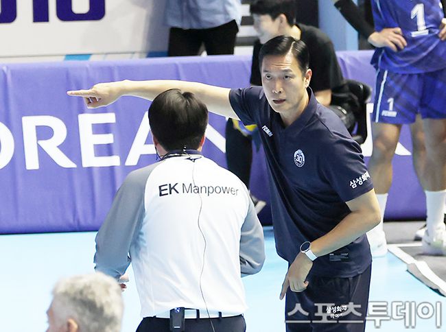 2025-2026 진에어 V-리그 남자부 대한항공-삼성화재 경기가 12일 인천 계양체육관에서 열렸다. 삼성화재 김상우 감독이 VAR 요청을 하고 있다. 2025.11.12. [스포츠투데이 권광일 기자 sports@stoo.com]