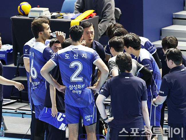 2025-2026 진에어 V-리그 남자부 대한항공-삼성화재 경기가 12일 인천 계양체육관에서 열렸다. 삼성화재 김상우 감독이 작전타임을 갖고 있다. 2025.11.12. [스포츠투데이 권광일 기자 sports@stoo.com]