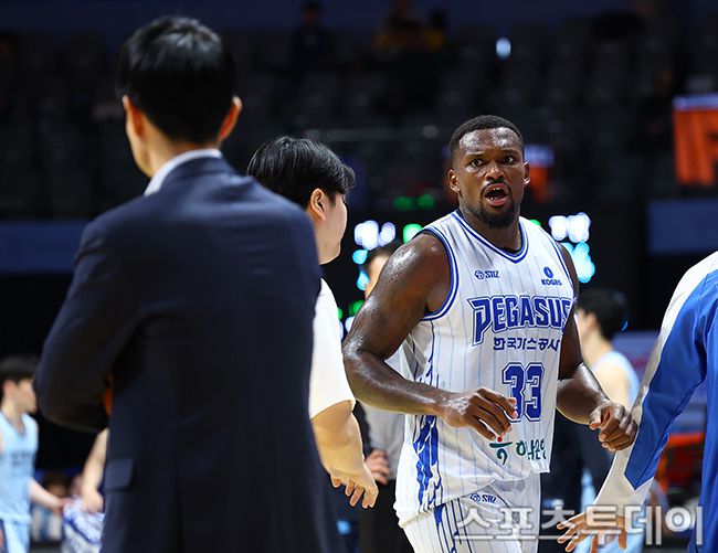 13일 경기도 고양체육관에서 열린 2025-2026 프로농구 고양 소노와 대구 한국가스공사의 경기, 한국가스공사 퍼킨스가 강혁 감독을 보고 있다. 2025.11.13. [스포츠투데이 팽현준 기자 sports@stoo.com]