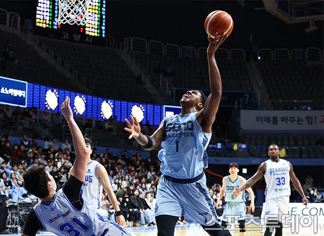 13일 경기도 고양체육관에서 열린 2025-2026 프로농구 고양 소노와 대구 한국가스공사의 경기, 소노 나이트가 골을 시도하고 있다. 2025.11.13. [스포츠투데이 팽현준 기자 sports@stoo.com]