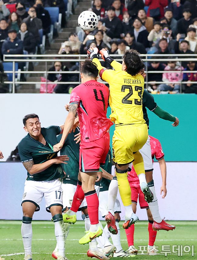 하나은행 초청 축구국가대표팀 대한민국-볼리비아 경기가 14일 대전 유성구 대전월드컵경기장에서 열렸다. 대한민국 김민재가 골밑에서 헤더를 시도하고 있다. 2025.11.14. [스포츠투데이 권광일 기자 sports@stoo.com]