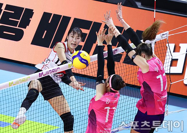 16일 인천 삼산월드체육관에서 열린 V리그 여자부 흥국생명과 정관장의 경기, 정관장 곽선옥이 공겨하고 있다. 2025.11.16. [스포츠투데이 팽현준 기자 sports@stoo.com]